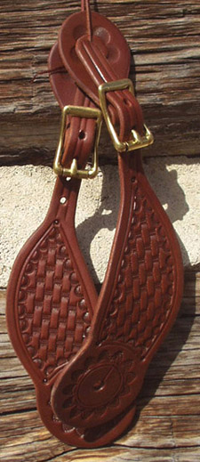 Geometric border stamped tapaderos with plain stirrups. Other styles of tapaderos available upon request. Semi-Martingale breast collar (doesn't go over the neck, but straps to breast collar dees), geometric stamped, latigo lined. Martingale with fancy 2" brass concho. Wrist Cuffs Cuffs protect the rider from brush and take the sting out of collisions with the saddle horn while roping. Shirt sleeves last longer when handling bales of hay.