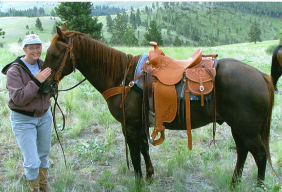 Pepper was great horse that we lost this year (2012). He was 29, never gave us a lick of trouble {except running down Hwy 191, Gallatin Canyon, his first time packing hay; lead rope was iced up, not his fault, was good for a laugh}, and recently packed small kids around for some of their first rides. He will be sorely missed; he was part of our family for 23 years. Shop apprentice Melinda Marsh with her new Chinks Melinda worked in the shop in Summer 2008 and is a natural. Look for great work from her.